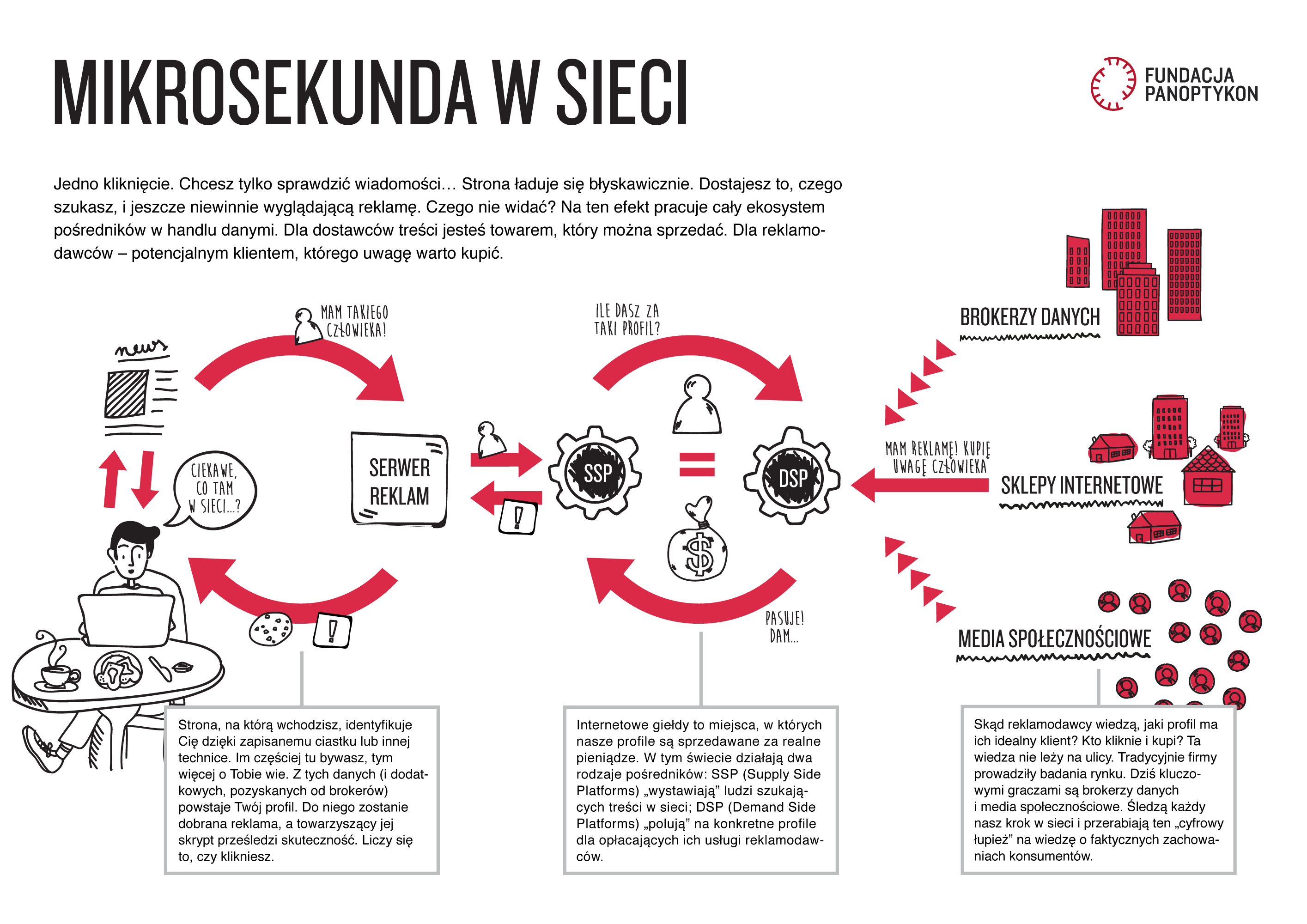 Podcast 07.11.2018 2 min. czytania Dźwięk Image Czy to my kupujemy w Internecie, czy nas kupują? Kto i z kim handluje naszymi danymi? Czy powinniśmy się tego obawiać? Jak zapytać, żeby dostać odpowiedź kto i co o nas wie? Zapraszamy w podróż po zapleczu Internetu w towarzystwie Macieja Zawadzińskiego, prezesa i współzałożyciela software house’u Clearcode specjalizującego się w technologiach reklamowych i marketingowych oraz platformy Piwik PRO, dostarczającej oprogramowanie do przetwarzania danych w duchu privacy by design. Na skróty: 00:01 Powitanie 01:40 Kto zobaczy, jakie produkty przeglądam w sklepie Internetowym? 03:00 Źródło informacji czy giełda - jak zmienił się Internet? 05:48 Reklama behawioralna czyli co w Internecie dzieje się w ciągu jednego mrugnięcia oka. 09:31 Jak działa giełda profili użytkowników czyli o relacji między sprzedawcą powierzchni (portal), danych (broker danych) i kupującego (reklamodawca). 12:00 Czym różni się model biznesowy Google’a i Facebooka? 16:00 Czy da się zarabiać nie śledząc użytkowników w Internecie? 21:00 „Dark pattern” czyli jak utrudnić użytkownikowi niezgadzanie się na śledzenie. 24:00 Czy reklama psuje jakość treści w Internecie? 27:00 Czy USA pójdzie w ślady za Europą i zmieni podejście do prywatności? 28:00 Zgoda według RODO – o co trzeba zapytać użytkownika Internetu? 31:30 Czy identyfikator użytkownika w Internecie podlega ochronie? 36:00 Czy reklama może wpływać na poglądy polityczne? 39:00 Jak dowiedzieć się, kto nas profiluje i co o nas wie? 44:00 Czy wydawca może nie wiedzieć, komu i jakie dane użytkownika udostępnia? Odsłuchaj Dowiedz się więcej o śledzeniu w Internecie: Infografika: Mikrosekunda w sieci Panoptykon: Śledzenie i profilowanie w sieci Panoptykon: Dyskryminacja w świecie rządzonym przez dane Clearcode: What is behavioral targeting and how does it work? Panoptykon: Dowiedz się, kto i co wie na Twój temat Norweska Rada ds. Konsumentów: Deceived by design. How tech companies use dark patterns to discourage us from exercising our rights to privacy Transkrypcja Audio file Anna Obem Autorka Temat biznes reklamowy algorytmy Poprzedni Następny Newsletter Otrzymuj informacje o działalności Fundacji Twoje dane przetwarza Fundacja Panoptykon w celu promowania działalności statutowej, analizy skuteczności podejmowanych działań i ewentualnej personalizacji komunikacji. Możesz zrezygnować z subskrypcji listy i zażądać usunięcia swojego adresu e-mail. Więcej informacji o tym, jak przetwarzamy twoje dane i jakie jeszcze prawa ci przysługują, w Polityce prywatności. Zapisz się Zapisz się Akceptuję Regulamin usługi Leave this field blank Zobacz także Artykuł ePrywatność czy eŚledzenie – czy branża reklamowa postawi na swoim? Pod wpływem lobbingu branży reklamowej w ostatniej wersji rozporządzenia ePrivacy pojawił się przepis, który legalizuje ciasteczka i skrypty śledzące dla tych usług, które utrzymują się z reklam. Za tą zmianą kryje się prosta logika: zamiast pytać użytkowników o zgodę (która i tak w wielu… 26.10.2018 Tekst Artykuł Twitter zakazuje reklam politycznych. Czy jego śladem pójdą inne platformy? Szef Twittera, Jack Dorsey, ogłosił, że od 22 listopada portal przestanie sprzedawać reklamy polityczne na całym świecie. Jego zdaniem reklamy polityczne w mediach społecznościowych – precyzyjnie targetowane, optymalizowane z pomocą algorytmów i niesprawdzane pod kątem zawartości fałszywych… 31.10.2019 Tekst Podcast Kryzys reklamy. Rozmowa z prof. Anną Gizą-Poleszczuk i Karoliną Iwańską W latach 90. hasło „ojciec prać” znał każdy. Jednak reklama już dawno straciła swój kultowy status, a jej twórcy częściej niż do tekstów kultury zerkają dziś do Excela. Z dzisiejszego odcinka podcastu dowiesz się między innymi, czy reklama napędzana danymi jest skuteczna, jaki procent budżetów… 05.03.2020 Dźwięk