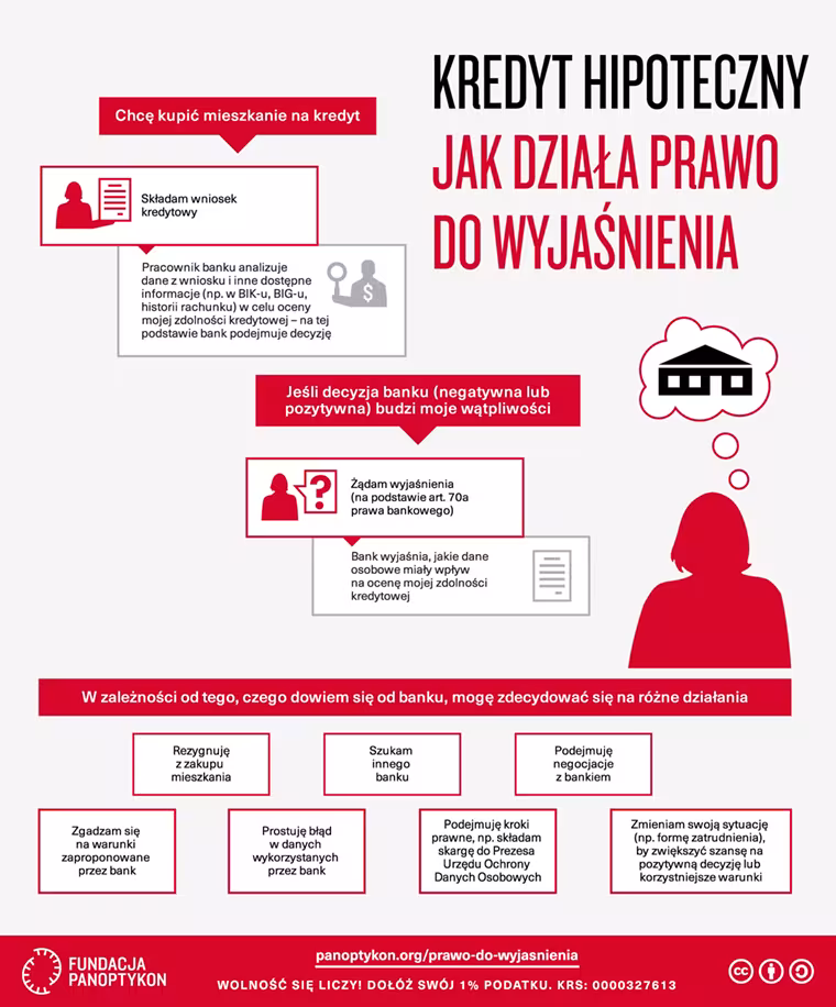 Poradnik 05.04.2019 17 min. czytania Tekst Image Tytuł Na jaki problem odpowiada nowe prawo? Co konkretnie zmienia się w przepisach? W jakich sytuacjach mogę skorzystać z prawa do wyjaśnienia? Skąd mam wiedzieć, czy decyzja w mojej sprawie była automatyczna, czy podjęta przez człowieka? W którym momencie mogę skorzystać z prawa do wyjaśnienia? Zamierzam wziąć kredyt. Jak nowe prawo zmieni moją sytuację? Czy nowe prawo ułatwi mi uzyskanie kredytu? Co powinno znaleźć się w wyjaśnieniu udzielonym przez bank? Po czym poznam, że dał mi „dobrą” odpowiedź? Czy bank powinien ujawnić algorytm, na którym opiera się ocena mojej zdolności kredytowej? Ile zapłacę za skorzystanie z prawa do wyjaśnienia? Wyjaśnienie decyzji udzielone przez bank wydaje mi się niejasne, niepełne. Co mogę zrobić? Niepokoi mnie informacja otrzymana od banku (np. wydaje mi się, że bank popełnił błąd albo źle mnie ocenił). Co mogę zrobić? Bank nie chce udzielić mi wyjaśnienia. Co mogę zrobić? Jestem przedsiębiorcą. Co się zmieni w mojej sytuacji? Prowadzę działalność gospodarczą, ale staram się o kredyt w celach prywatnych. Czy mogę skorzystać z prawa do wyjaśnienia? Kiedy nowe prawo wejdzie w życie? Czy podobne przepisy obowiązują w innych krajach Unii Europejskiej? Co w tej sprawie zrobiła Fundacja Panoptykon? Tytuł Na jaki problem odpowiada nowe prawo? Co konkretnie zmienia się w przepisach? W jakich sytuacjach mogę skorzystać z prawa do wyjaśnienia? Skąd mam wiedzieć, czy decyzja w mojej sprawie była automatyczna, czy podjęta przez człowieka? W którym momencie mogę skorzystać z prawa do wyjaśnienia? Zamierzam wziąć kredyt. Jak nowe prawo zmieni moją sytuację? Czy nowe prawo ułatwi mi uzyskanie kredytu? Co powinno znaleźć się w wyjaśnieniu udzielonym przez bank? Po czym poznam, że dał mi „dobrą” odpowiedź? Czy bank powinien ujawnić algorytm, na którym opiera się ocena mojej zdolności kredytowej? Ile zapłacę za skorzystanie z prawa do wyjaśnienia? Wyjaśnienie decyzji udzielone przez bank wydaje mi się niejasne, niepełne. Co mogę zrobić? Niepokoi mnie informacja otrzymana od banku (np. wydaje mi się, że bank popełnił błąd albo źle mnie ocenił). Co mogę zrobić? Bank nie chce udzielić mi wyjaśnienia. Co mogę zrobić? Jestem przedsiębiorcą. Co się zmieni w mojej sytuacji? Prowadzę działalność gospodarczą, ale staram się o kredyt w celach prywatnych. Czy mogę skorzystać z prawa do wyjaśnienia? Kiedy nowe prawo wejdzie w życie? Czy podobne przepisy obowiązują w innych krajach Unii Europejskiej? Co w tej sprawie zrobiła Fundacja Panoptykon? W kwietniu wejdzie w życie nowe prawo: do wyjaśnienia decyzji kredytowej. Na jaki problem odpowiada? Co konkretnie zmienia się w przepisach? W jakich sytuacjach będzie można skorzystać z nowego prawa? Ile będzie to kosztowało? Odpowiadamy na najważniejsze pytania. Na jaki problem odpowiada nowe prawo? Do tej pory klient ubiegający się o kredyt w banku nie miał możliwości sprawdzenia, jakie jego dane zostały wzięte pod uwagę przy ocenie zdolności kredytowej i co przy tej ocenie miało znaczenie. Na przykład: czy o niskiej ocenie zdolności kredytowej przesądziło to, że za mało zarabia, czy to, że za dużo wydaje na życie? A może tylko to, że kiedyś nie zapłacił w terminie rachunku za telefon? Mieliśmy tylko ogólną wiedzę o tym, jak przebiega weryfikacja zdolności i wiarygodności kredytowej. W dużym uproszczeniu: składają się na nią trzy oceny. W oparciu o dane pozyskane m.in. z Biura Informacji Kredytowej (BIK), od innych banków i z wniosku klienta bank weryfikuje: historię spłacanych zobowiązań; aktualną sytuację finansową, czyli zarobki, wydatki i inne zobowiązania (w tym przyznane limity na kartach kredytowych); wskaźnik wiarygodności (tzw. scoring), który ma wskazać prawdopodobieństwo terminowej spłaty kredytu (więcej w artykule pt. Dlaczego bank odmówił Ci kredytu?). Bez informacji o tym, co źle wpływa na ich wiarygodność lub zdolność kredytową, klienci, którym zależy na kredycie, są zagubieni. Zdarza się, że przy kolejnym wniosku zaniżają informacje o swoich wydatkach (narażając się na odpowiedzialność karną) i ryzykują to, że tak pozyskany kredyt wciągnie ich w spiralę zadłużenia. A przecież w grę wchodzą ich dane osobowe, które mają prawo weryfikować, poprawiać i uzupełniać! Ta sytuacja szkodzi również bankom, bo zwiększa ryzyko tego, że błędnie ocenią swoich klientów (dadzą kredyt komuś, kogo na to nie stać – albo odwrotnie). Co konkretnie zmienia się w przepisach? Pod koniec kwietnia wchodzi w życie ustawa o zmianie niektórych ustaw w związku z zapewnieniem stosowania rozporządzenia 2016/679. Jej celem jest dostosowanie różnych przepisów – w tym prawa bankowego i ustawy o kredycie konsumenckim – do RODO. Oto kluczowe fragmenty tej ustawy, dotyczące prawa do wyjaśnienia: Art. 70a 1. Banki i inne instytucje ustawowo upoważnione do udzielania kredytów na wniosek osoby fizycznej, prawnej lub jednostki organizacyjnej niemającej osobowości prawnej, o ile posiada zdolność prawną, ubiegającej się o kredyt przekazują, w formie pisemnej, wyjaśnienie dotyczące dokonanej przez siebie oceny zdolności kredytowej wnioskującego. 2. Wyjaśnienie, o którym mowa w ust. 1, obejmuje informacje na temat czynników, w tym danych osobowych wnioskującego, które miały wpływ na dokonaną ocenę zdolności kredytowej. 3. W przypadku przedsiębiorców bank i inna instytucja ustawowo upoważniona do udzielania kredytów może pobierać opłatę za sporządzenie wyjaśnienia, o którym mowa w ust. 1. Wysokość opłaty powinna być odpowiednia do wysokości kredytu. 4. Przepisy ust. 1–3 stosuje się odpowiednio do przedsiębiorcy ubiegającego się o pożyczkę pieniężną. Art. 105a ust. 1c 1a. Banki, inne instytucje ustawowo upowa