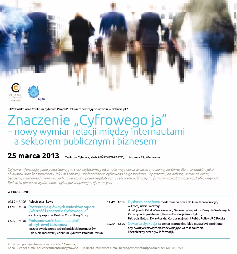 Znaczenie „Cyfrowego ja” – nowy wymiar relacji między internautami a sektorem publicznym i biznesem - to tytuł debaty, która odbędzie się w Warszawie 25 marca 2013. W dyskusji panelowej wezmą udział: Generalny Inspektor Ochrony Danych Osobowych dr Wojciech Wiewiórowski, prezeska Fundacji Panoptykon…