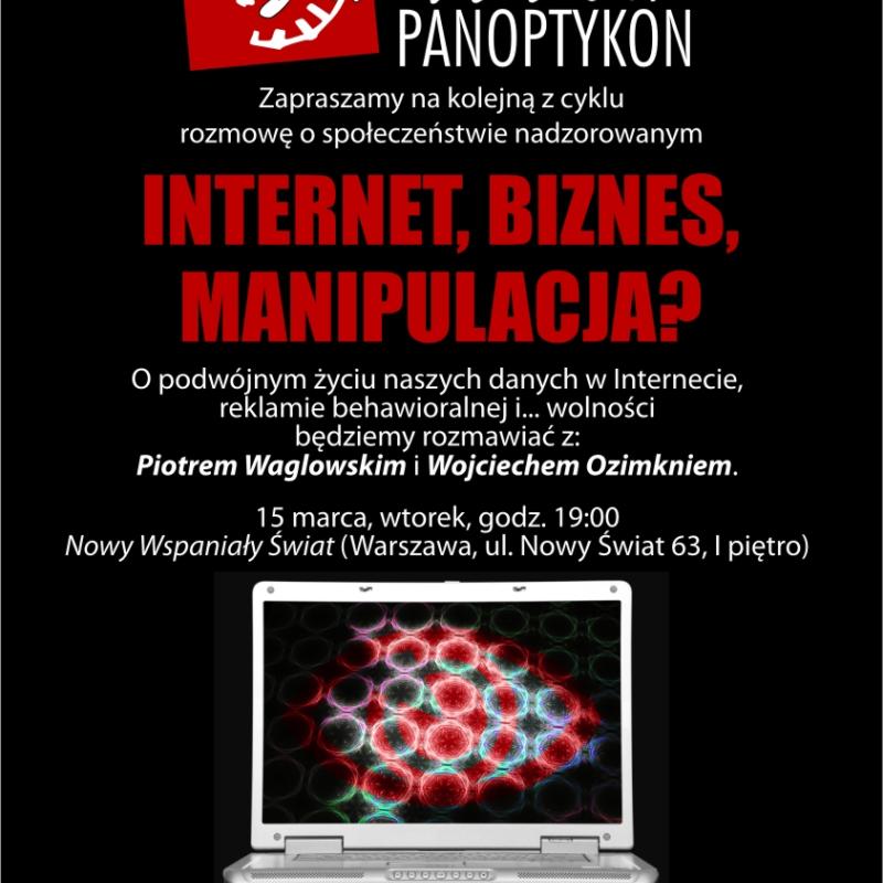 Artykuł Seminarium Panoptykon: Internet, biznes, manipulacja? Na najbliższym Seminarium Panoptykon porozmawiamy o tym: Jak działa reklama behawioralna i profilowanie? Ile o nas wiedzą i jak to wykorzystują aplikacje internetowe? Ile o „podwójnym życiu” jego danych wie przeciętny użytkownik Internetu? Czy nowe formy marketingu to forma manipulacji i nadzoru nad społeczeństwem czy tylko specyficzne usługi tworzone dla naszej wygody? Kto na tym zarabia, a kto traci? Naszymi gośćmi będą: Piotr "Vagla" Waglowski i Wojciech Ozimek. 09.03.2011 Tekst