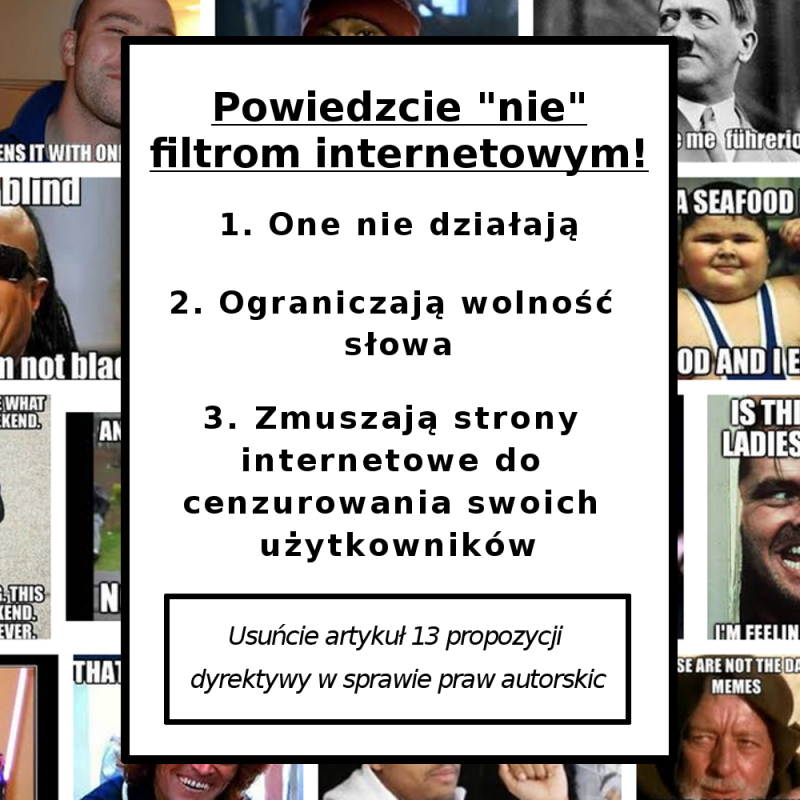 Artykuł NIE dla filtrowania internetu! Internet, jaki znamy, jest zagrożony. Dlaczego? Komisja Europejska proponuje, by wszystkie teksty, obrazki czy multimedia, jakie udostępniamy w popularnych serwisach społecznościowych, były filtrowane przez algorytm. Te, które automat zidentyfikuje jako naruszające prawo autorskie, nie zostaną opublikowane. To mogą być memy, filmy z wakacji, ale także teksty, takie jak recenzje cytujące inne opracowania czy materiały. 21.02.2018 Tekst