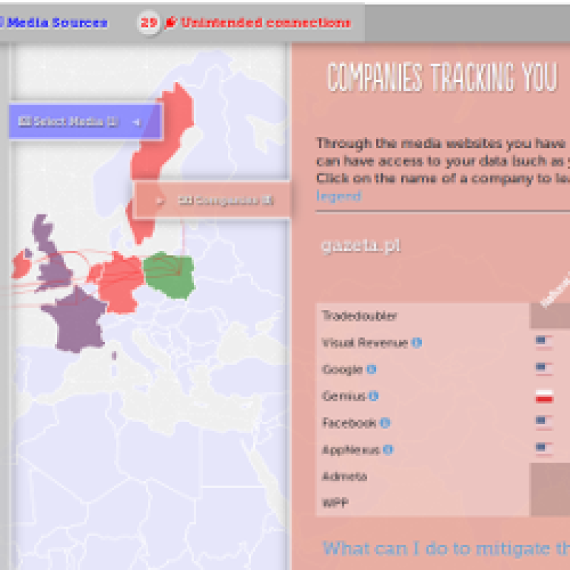 Artykuł Kto śledzi Cię, kiedy czytasz informacje w sieci… Kto śledzi Cię, kiedy czytasz informacje w sieci? Na to pytanie próbuje odpowiedzieć Trackography – najnowsza aplikacja organizacji Tactical Tech. Serwis, po wybraniu kraju oraz medium (np. Gazeta.pl lub rzeczpospolita.pl), pozwala sprawdzić, jakie informacje o czytelnikach gromadzi dany portal i gdzie one trafiają. Mapa pokazuje lokalizację firm zbierających dane, a tabela obok zawiera informacje o ich polityce retencji czy wykorzystywaniu danych do profilowania. 07.01.2015 Tekst