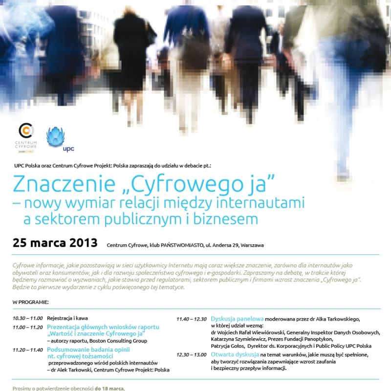 Artykuł Zaproszenie na debatę Znaczenie „Cyfrowego ja” – nowy wymiar relacji między internautami a sektorem publicznym i biznesem - to tytuł debaty, która odbędzie się w Warszawie 25 marca 2013. W dyskusji panelowej wezmą udział: Generalny Inspektor Ochrony Danych Osobowych dr Wojciech Wiewiórowski, prezeska Fundacji Panoptykon Katarzyna Szymielewicz oraz Dyrektor ds. Korporacyjnych i Public Policy UPC Polska. Zapraszamy w imieniu organizatorów: UPC Polska oraz Centrum Cyfrowego Projekt: Polska. 13.03.2013 Tekst