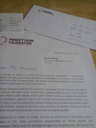 Żeby nieco odreagować tę frustrację, postanowiliśmy na chwilę zmienić front: zamiast toczyć jałowy dialog z naszym rządem, napisaliśmy bezpośrednio do Baracka Obamy. Szukamy brakujących odpowiedzi na najważniejsze pytania, przede wszystkim o współpracę polskich i amerykańskich służb oraz wykorzystywanie PRISM i innych programów w stosunku do polskich obywateli i polityków. Może Obama będzie wiedział, skąd Prezydent RP dowiedział się o PRISM, skoro nie wie tego jego kancelaria? Wychodzimy z założenia, że ten, który „słyszy wszystko”, również w tej sprawie powinien być dobrze poinformowany ;-)